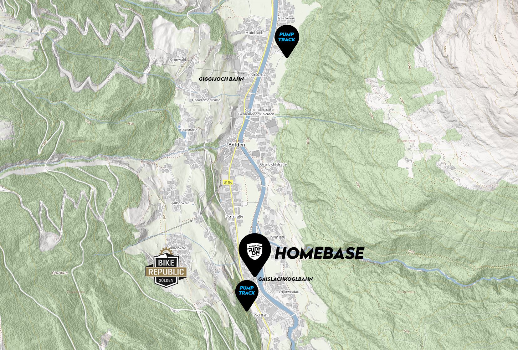 Die Homebase der Bikeschool RIDE ON befindet sich bei der Sporthütte Fiegl in in Sölden. Unsere Homebase ist gleichzeitig Treff- und Ausgangspunkt für alle Kurse. Von hier aus starten wir direkt los um die Bike Republic Sölden zu erkunden; mit der nahegelegenen Gaislachkoglbahn gelangen wir im Nullkommanix rauf auf den Berg und rein ins Bikevergnügen. Auf Anfrage können andere Treffpunkte vereinbart werden.